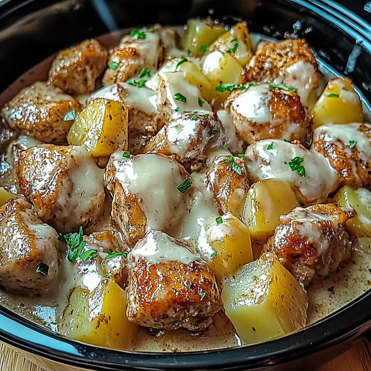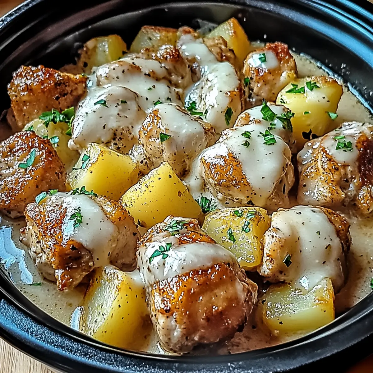 Pour Sauce Into Crockpot: Drizzle your creamy sauce over the chicken and potatoes, making sure everything is beautifully coated in that garlicky goodness.