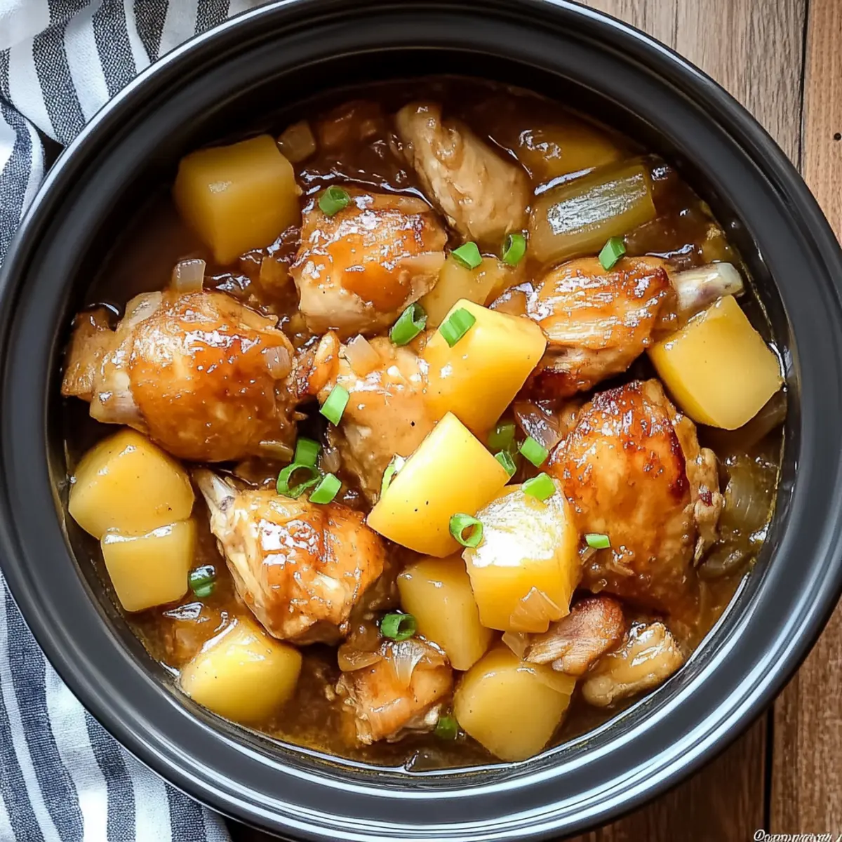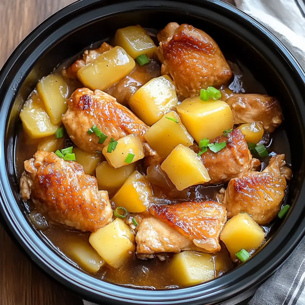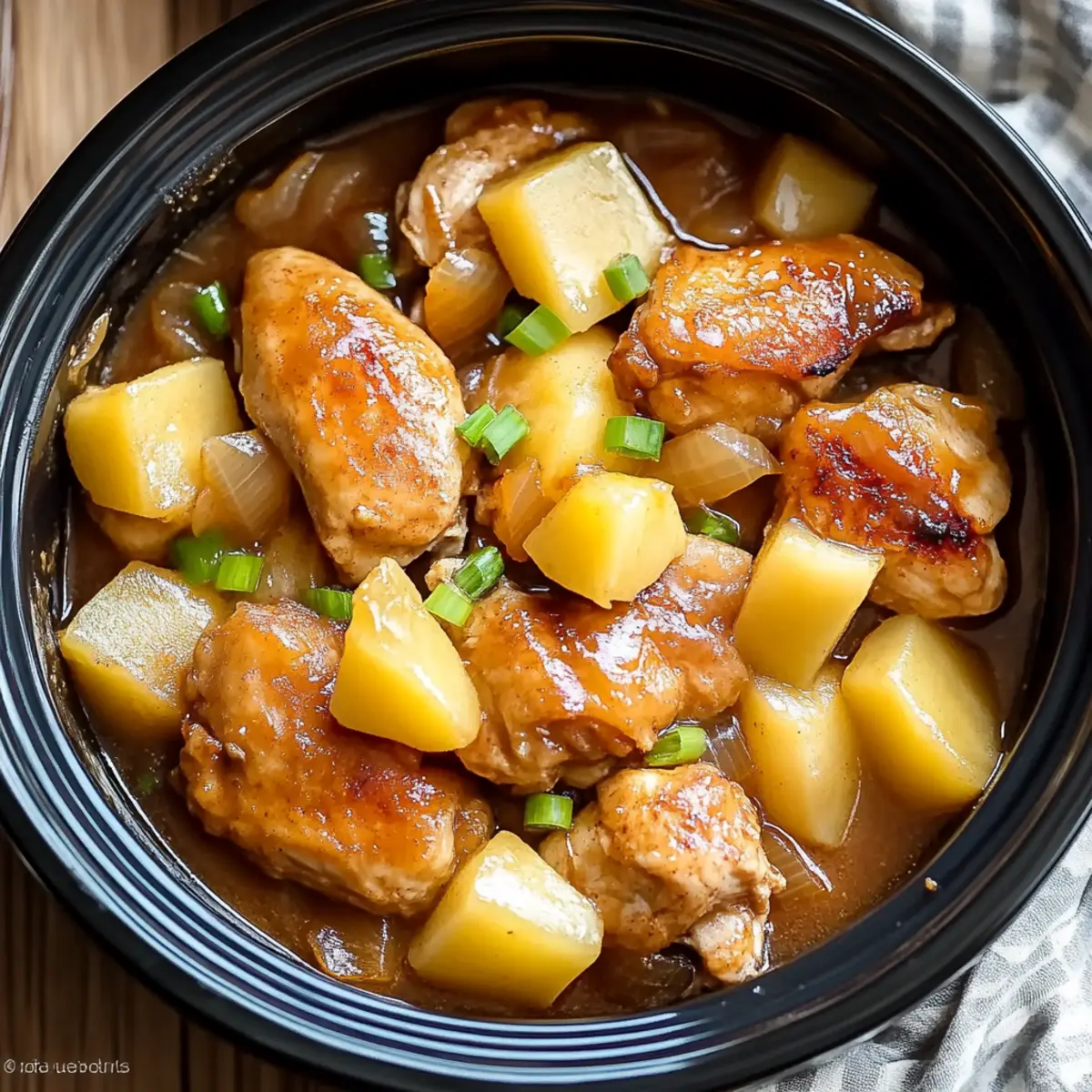Assemble in Crockpot: Layer the seasoned chicken at the bottom of the crockpot. Pour the sauce over the chicken, ensuring it's evenly coated, and add the pineapple chunks on top for extra flavor and texture.