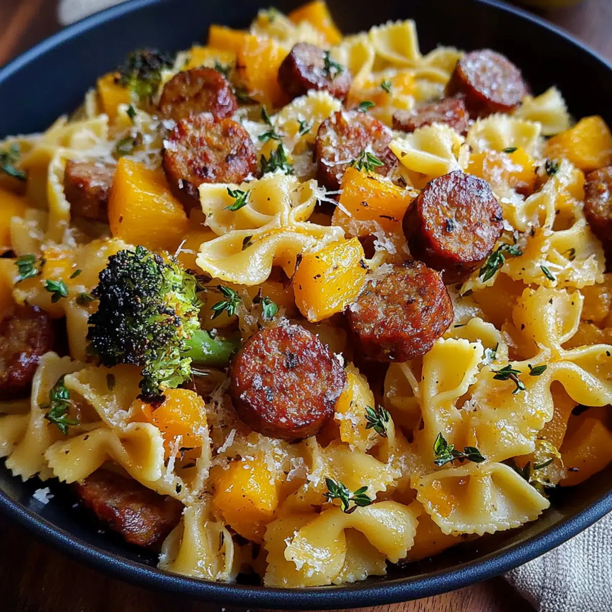 These Delicious Autumn Sausage Pasta Squash components are perfect for meal prep! You can roast the butternut squash and Brussels sprouts up to 3 days in advance and store them in an airtight container in the refrigerator. Additionally, cook the bow tie pasta and sauté the smoked sausage ahead of time, storing each in separate containers. When you're ready to enjoy this comforting dish, simply reheat the vegetables and sausage in a skillet, toss in the cooked pasta, and warm through with the garlic butter sauce for a delicious meal that tastes just as fresh as when first prepared. This approach not only saves time during hectic weeknights but also maintains the rich flavors.